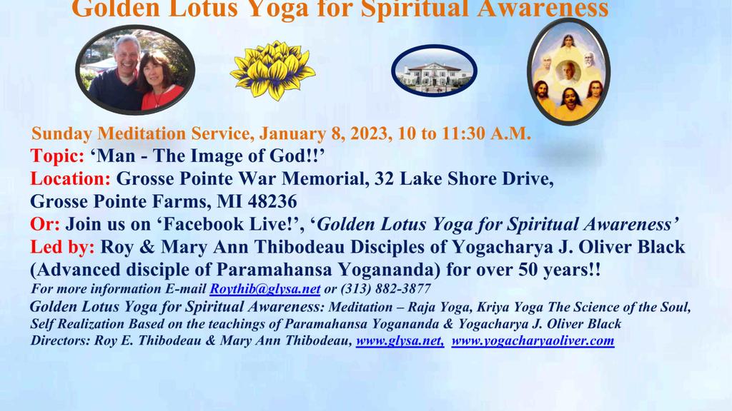 Join us for our Sunday Meditation Service – ‘Man – The Image of God!’ at the Grosse Pointe War Memorial at 10 am. Or join us Facebook Live! The Facebook page is **Golden Lotus Yoga for Spiritual Awarenesss**.