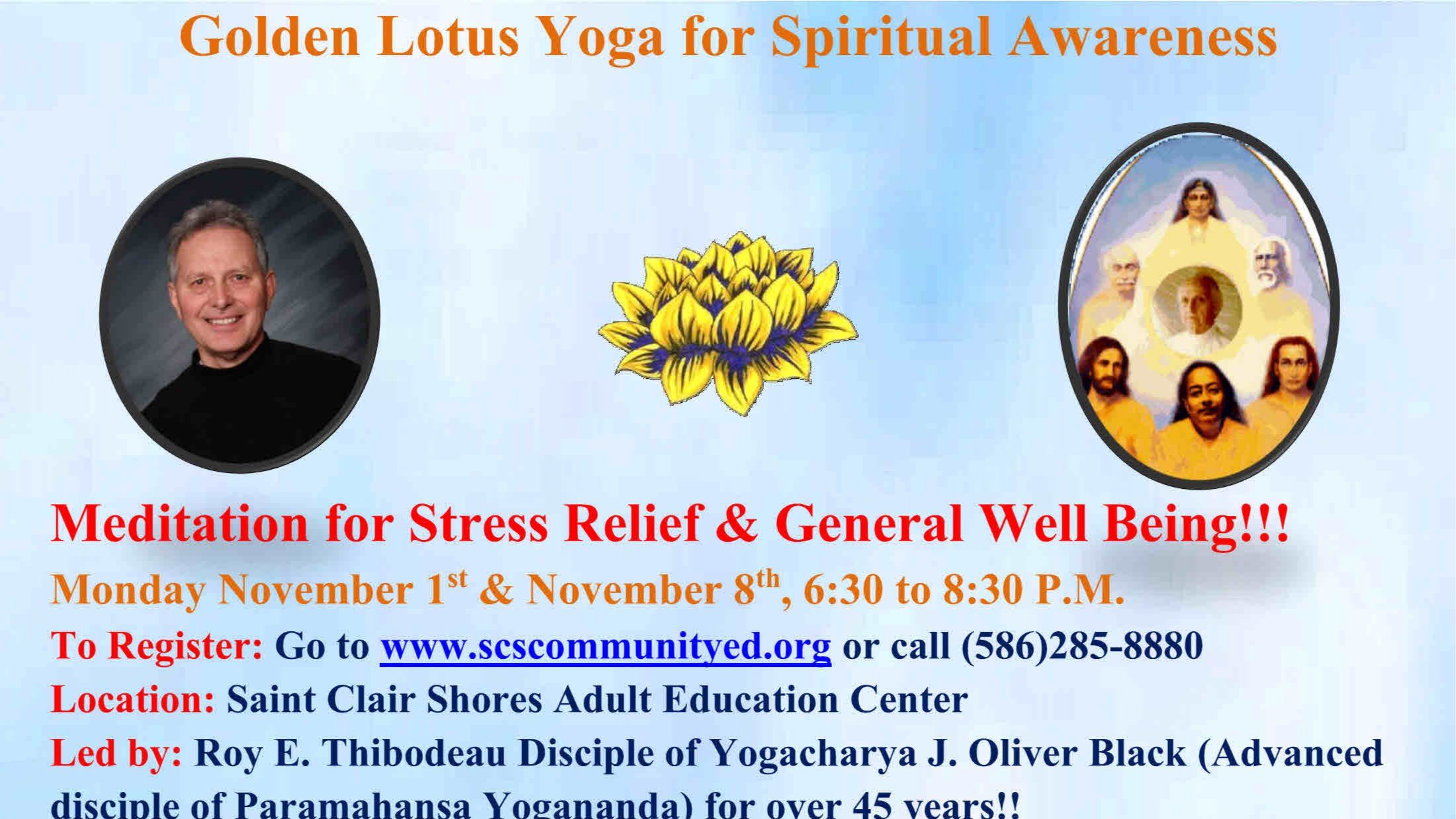 The Class will teach scientific techniques of Yoga Meditation universally accept to reduce stress and create a sense of upliftment and contentment. The instructor, Roy E. Thibodeau, has been practicing and teaching Meditation and Yoga for more than 45 Years. The class will include scientific and philosophical rational that supports the practice of Meditation. All levels of experience Welcome.