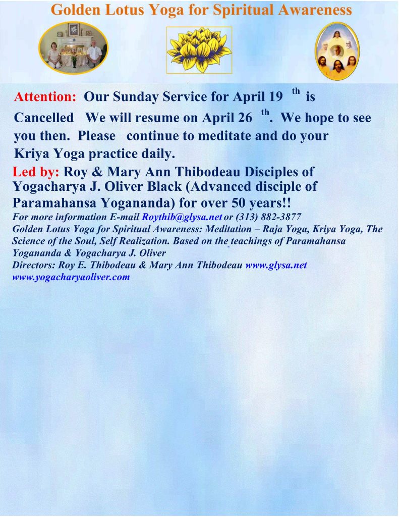 ‘Sunday Meditation Service April 19th is Cancelled!’