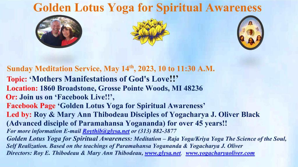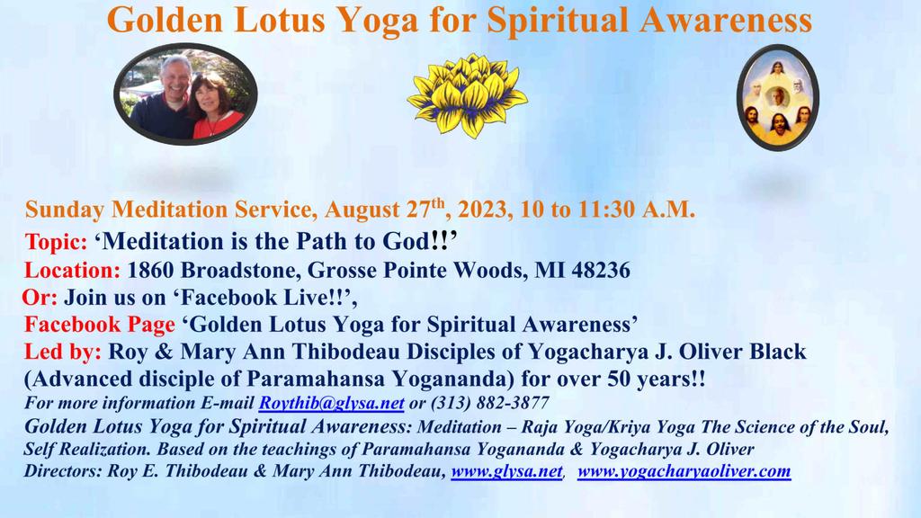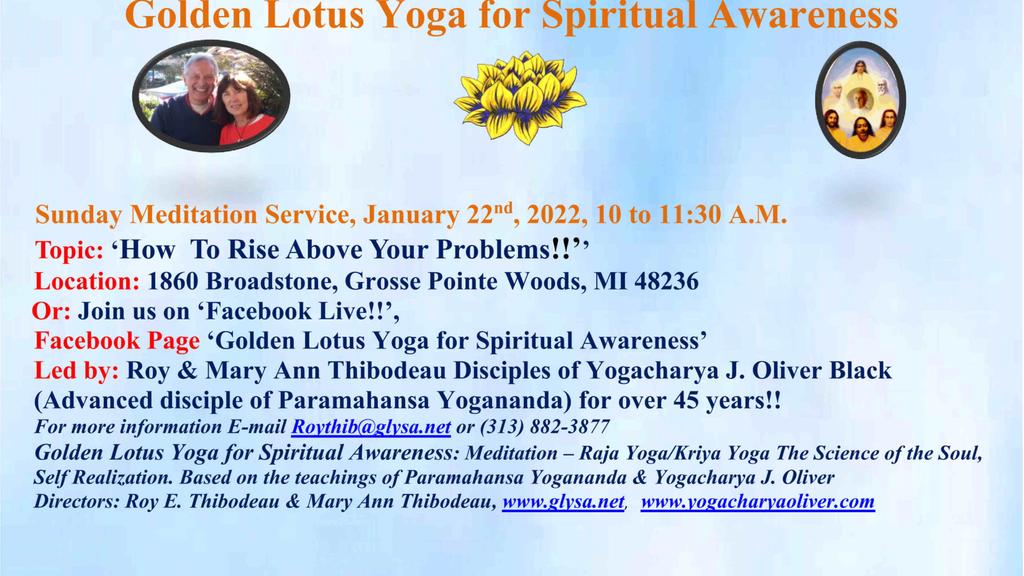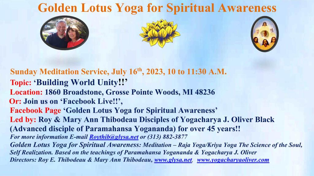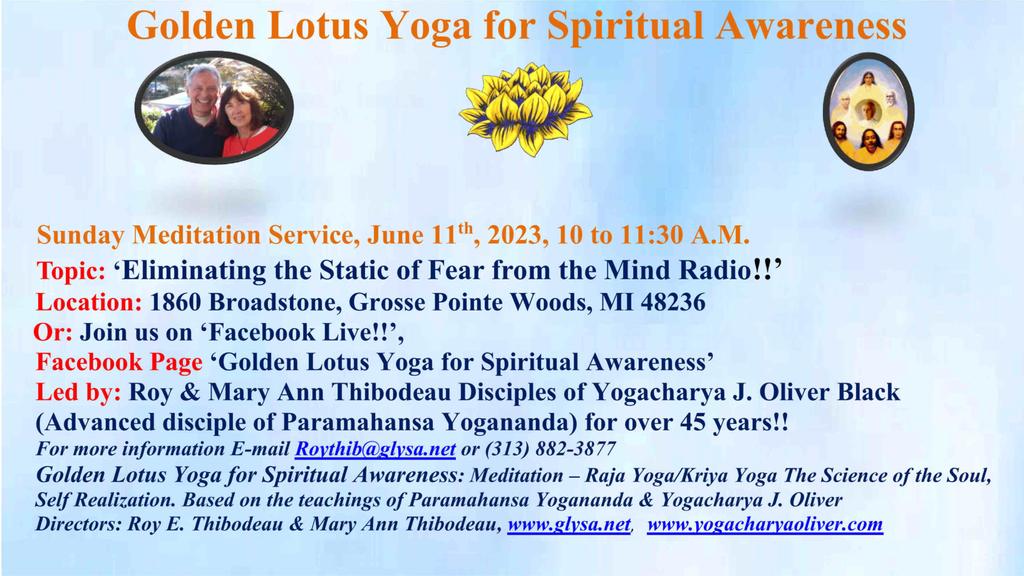 1860 Broadstone Rd 1860 Broadstone Rd, Grosse Pointe Woods, Mi, United StatesJoin us for our Sunday Meditation Service - 'How to Dissolve the Causes of War!' Or join us on Facebook Live! Our Facebook Page is ***Golden Lotus Yoga for Spiritual Awareness***
