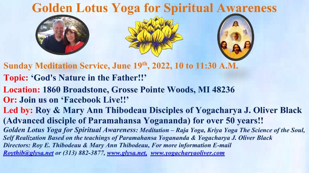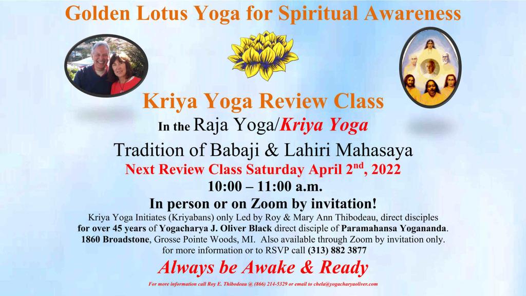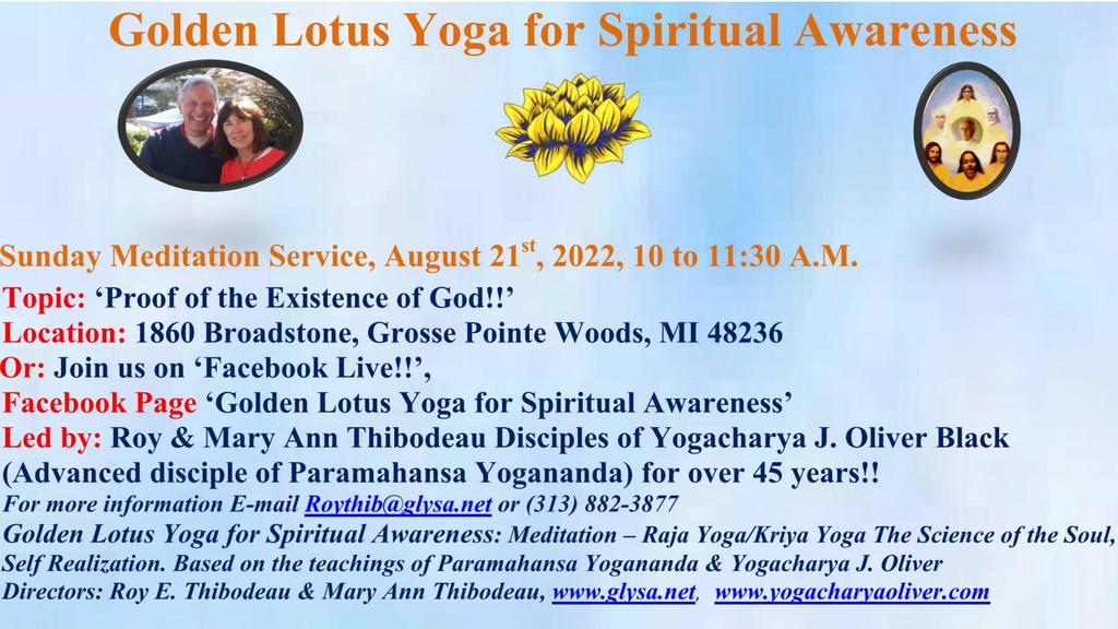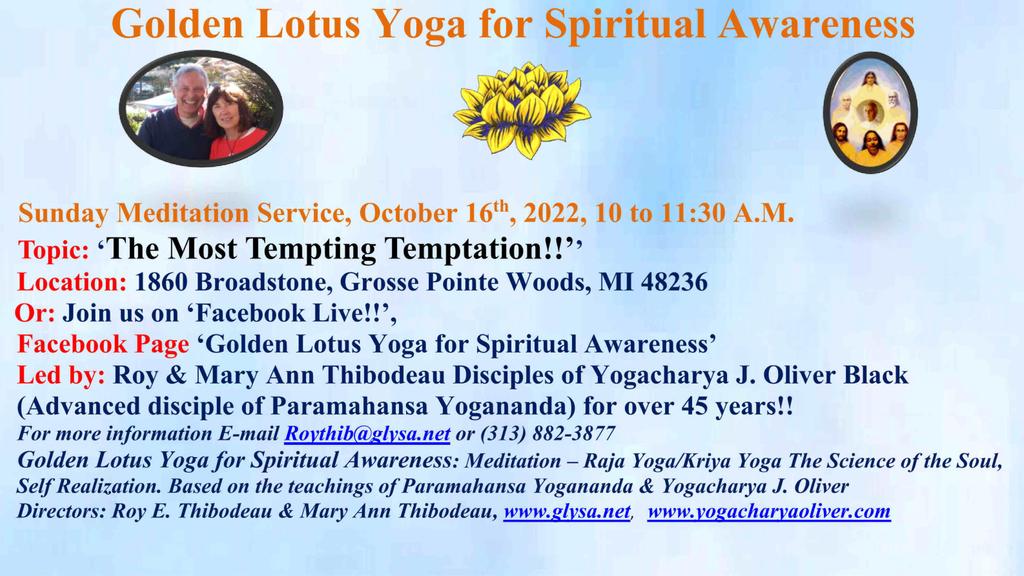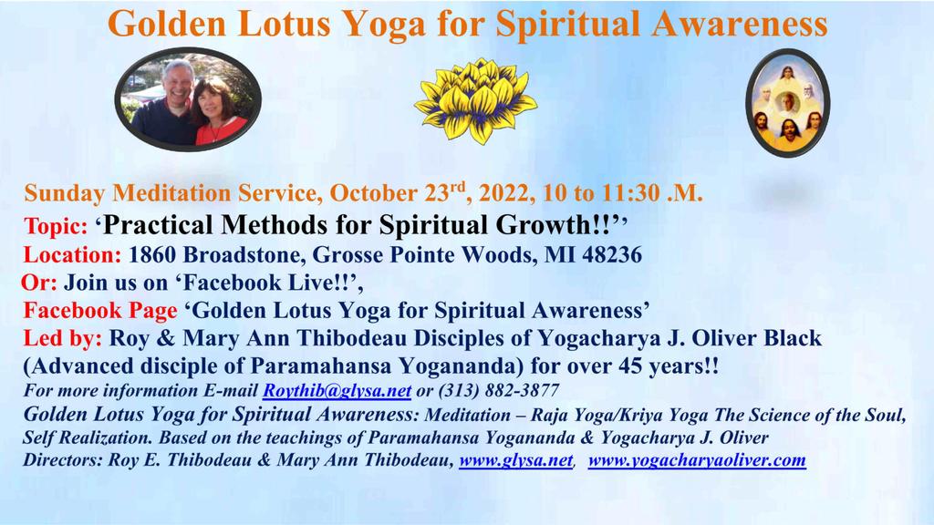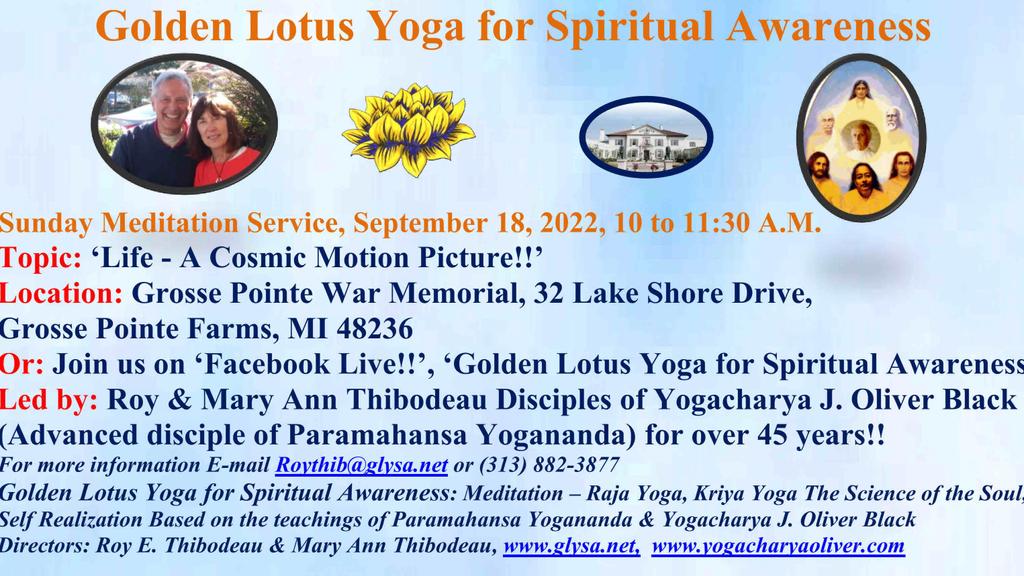 1860 Broadstone Rd 1860 Broadstone Rd, Grosse Pointe Woods, Mi, United Stateshttp://photos4.meetupstatic.com/photos/event/5/b/1/5/600_434663317.jpeg All levels of Meditators or welcome. There will be instructions and inspiration for new inexperienced meditators. The hosts, meditators and Kriya Yoga initiates for over 45 years, are direct disciples of Yogacharya J. Oliver Black one of Paramahansa Yogananda's most advanced male disciples. He is the founder of Golden Lotus, Inc., which owns & operates 'Song of the Morning' an 800 acre Yoga Retreat Northest of Gaylord, MI on the Pigeon River. Paramahansa Yogananda […]