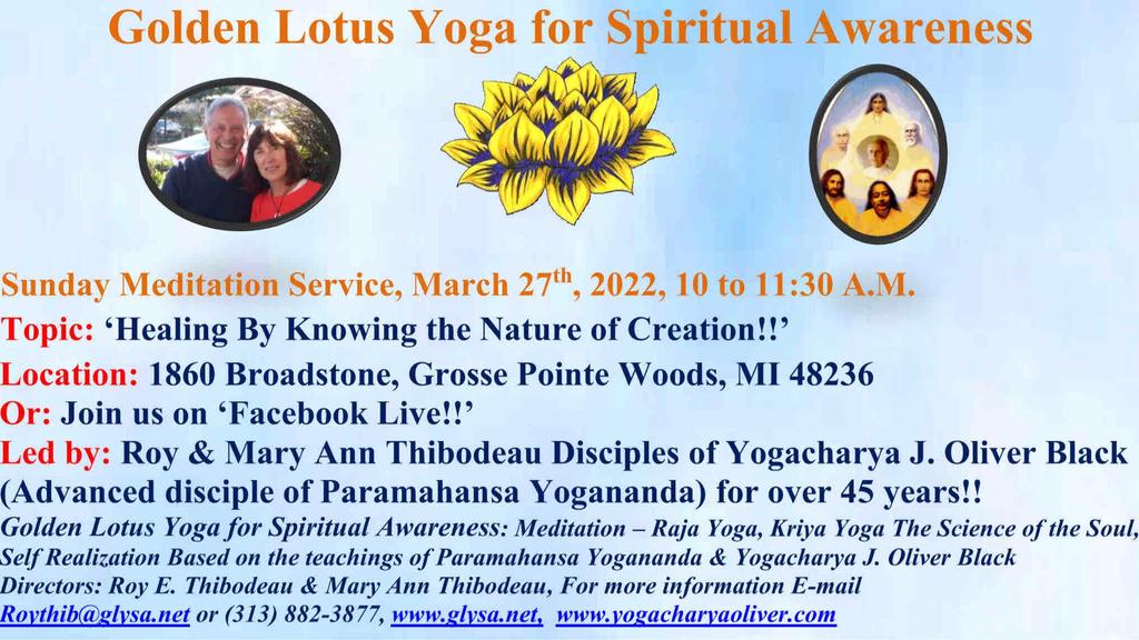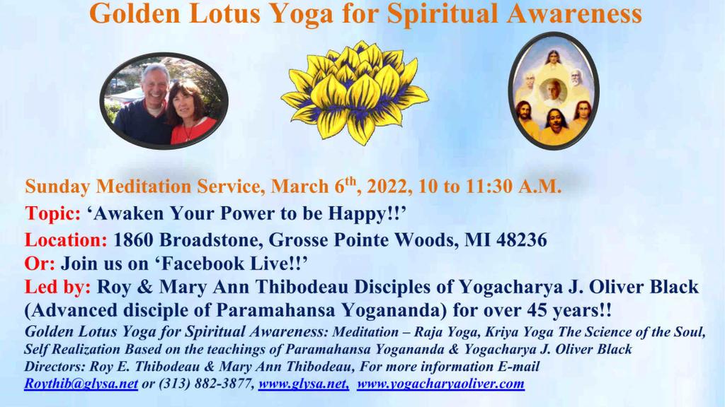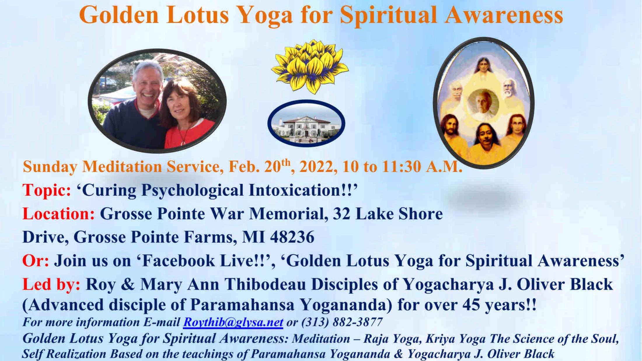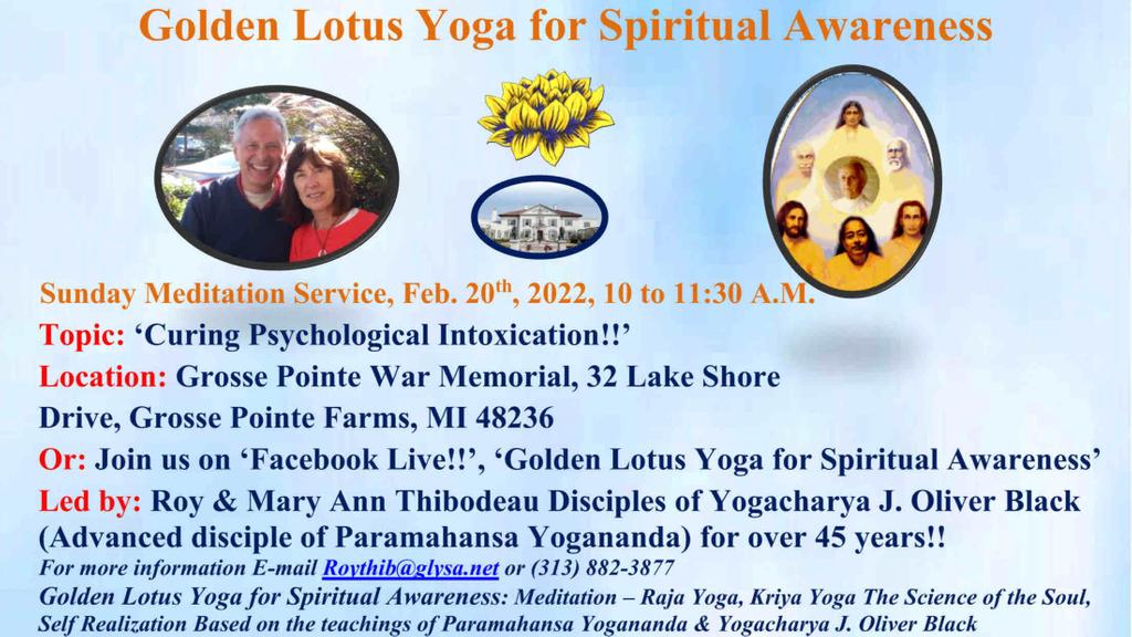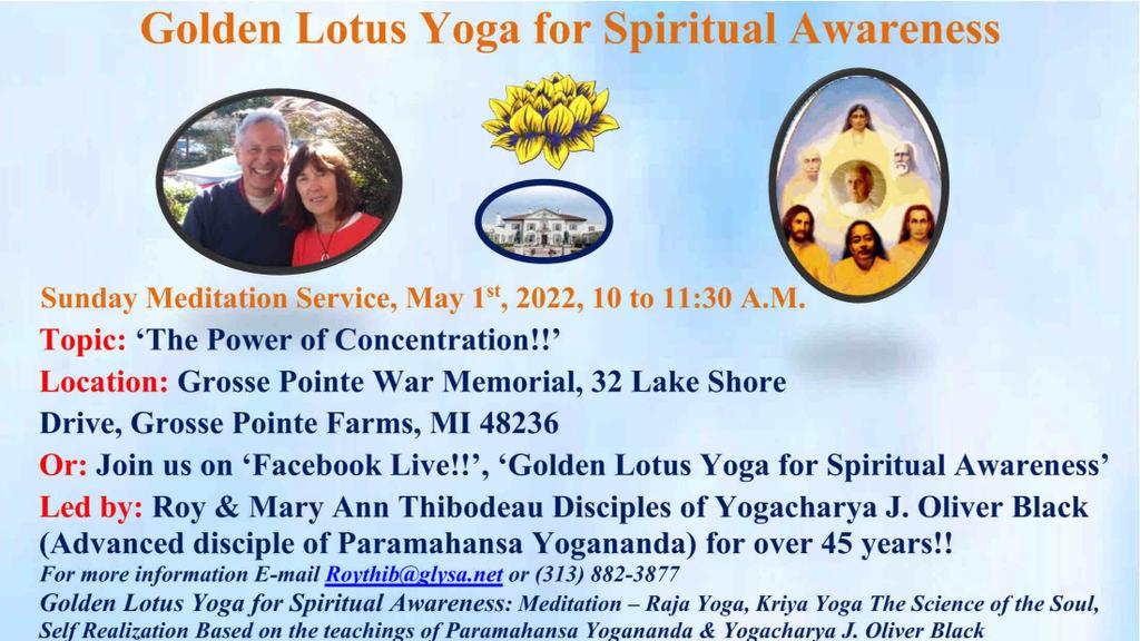 1860 Broadstone Rd 1860 Broadstone Rd, Grosse Pointe Woods, Mi, United Stateshttp://photos4.meetupstatic.com/photos/event/5/b/1/5/600_434663317.jpeg All levels of Meditators or welcome. There will be instructions and inspiration for new inexperienced meditators. The hosts, meditators and Kriya Yoga initiates for over 45 years, are direct disciples of Yogacharya J. Oliver Black one of Paramahansa Yogananda's most advanced male disciples. He is the founder of Golden Lotus, Inc., which owns & operates 'Song of the Morning' an 800 acre Yoga Retreat Northest of Gaylord, MI on the Pigeon River. Paramahansa Yogananda […]